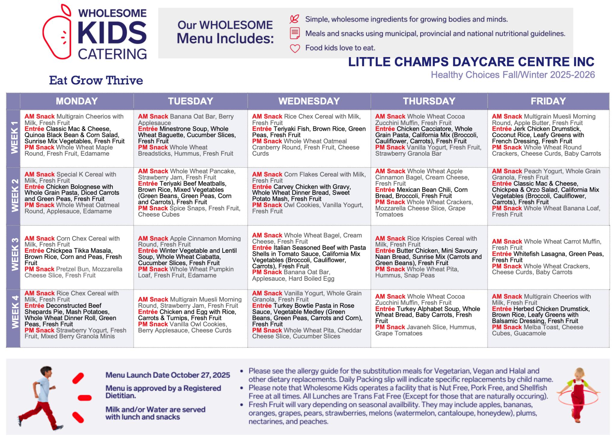 We believe that in order for our children to grow to be healthy and strong, they need to be provided with a foundation healthy and nutritious meals. This is why all of our menus are certified by a nutritionist to ensure that every single meal meets and exceeds the Canada’s Food Guide standards. Wholesome Kids Catering prepares each meal fresh daily for the children. All of our their baked goods are made from scratch to ensure that children are getting the best quality ingredients in the meals that we provide. If your child has any allergies, intolerances or dietary restrictions, please let us know and we will help cater to their needs with proper substitutions provided by the catering company.